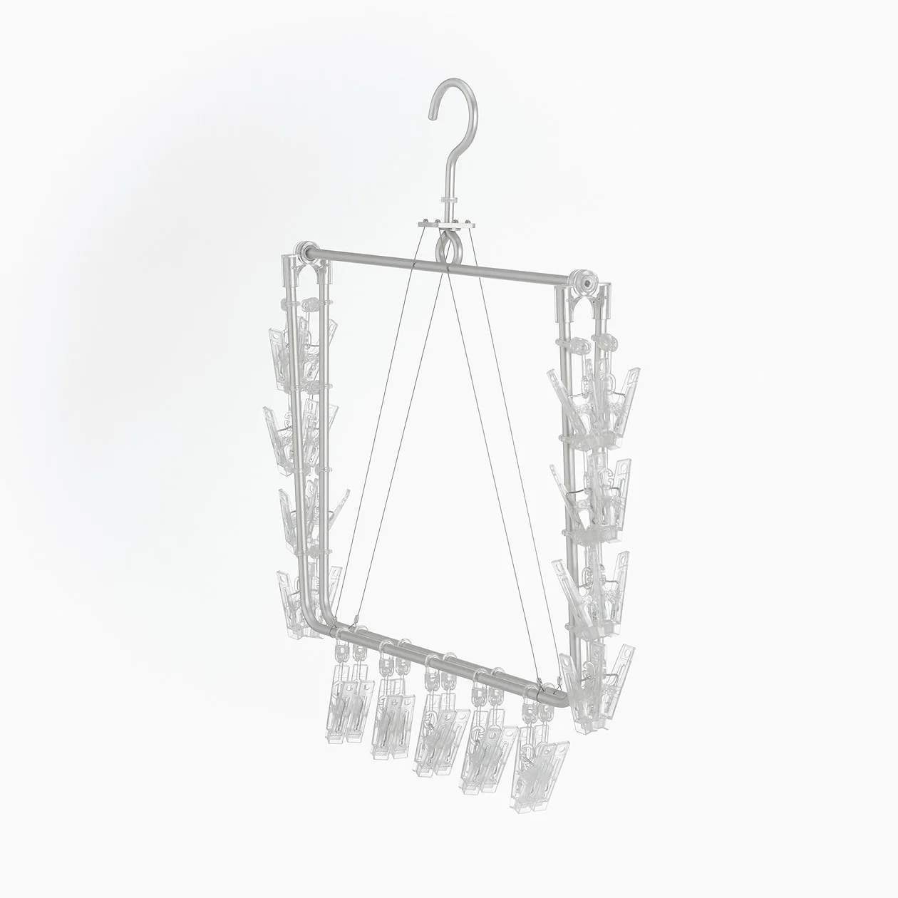 The frame is made with light and sturdy aluminum pipes, and the pegs are made of polycarbonate. Comes with a total of 26 pegs. The hanger is also foldable for making storage easier.