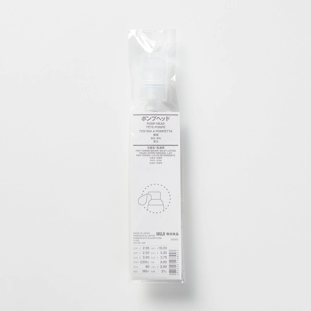 A pump head that fits in MUJI skincare bottles. Users can dispense skincare onto hand or straight onto a cotton pad.