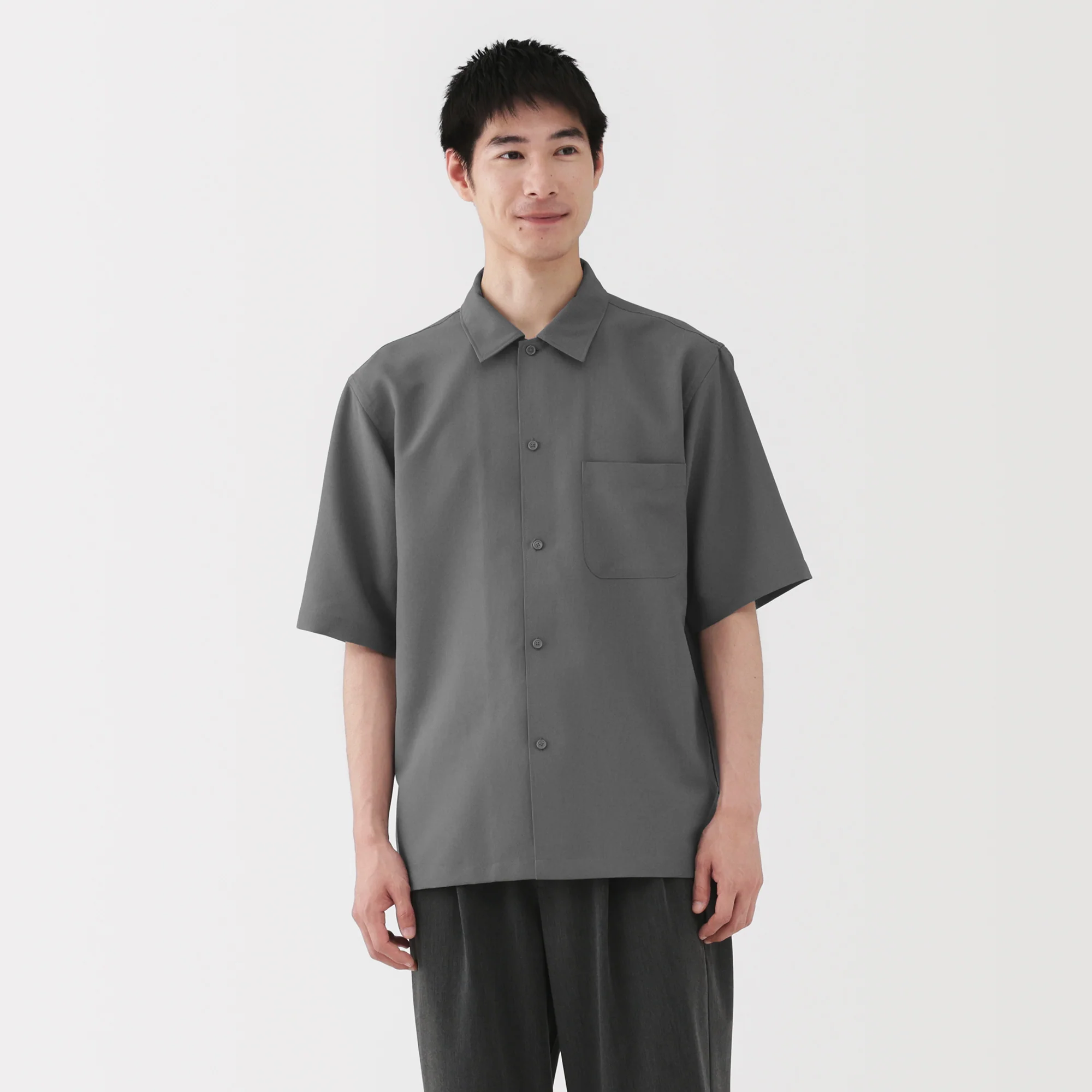 This button-down half sleeve shirt is made from a stretchy and breathable material, giving it a cool and refreshing feeling. It is designed with a relaxed silhouette for a comfortable fit. Made with partially recycled materials.