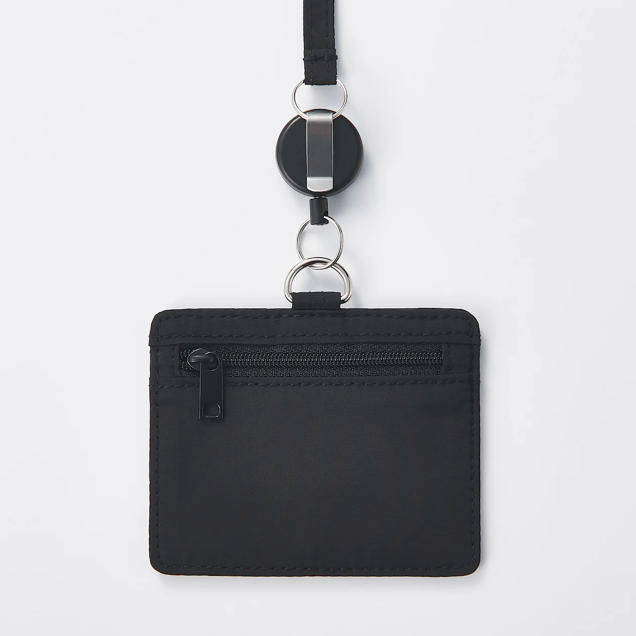 A single card holder designed with an extendable reel attachment. You can conveniently attach one end of the reel to the strap of your purse or bag, and simply pull on the card case to extend the reel and use the card inside.