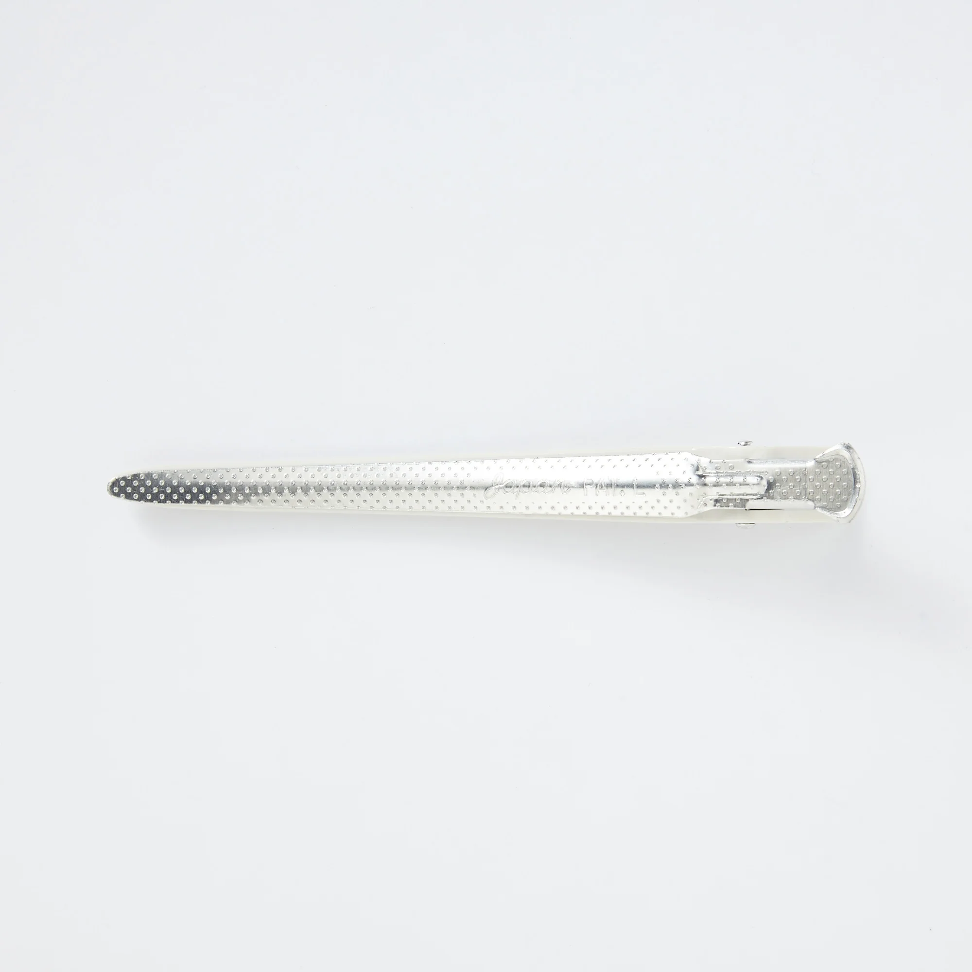 Durable hair clip made from a combination of polycarbonate metal and stainless steel. Curved to better fit your head when styling or trimming.