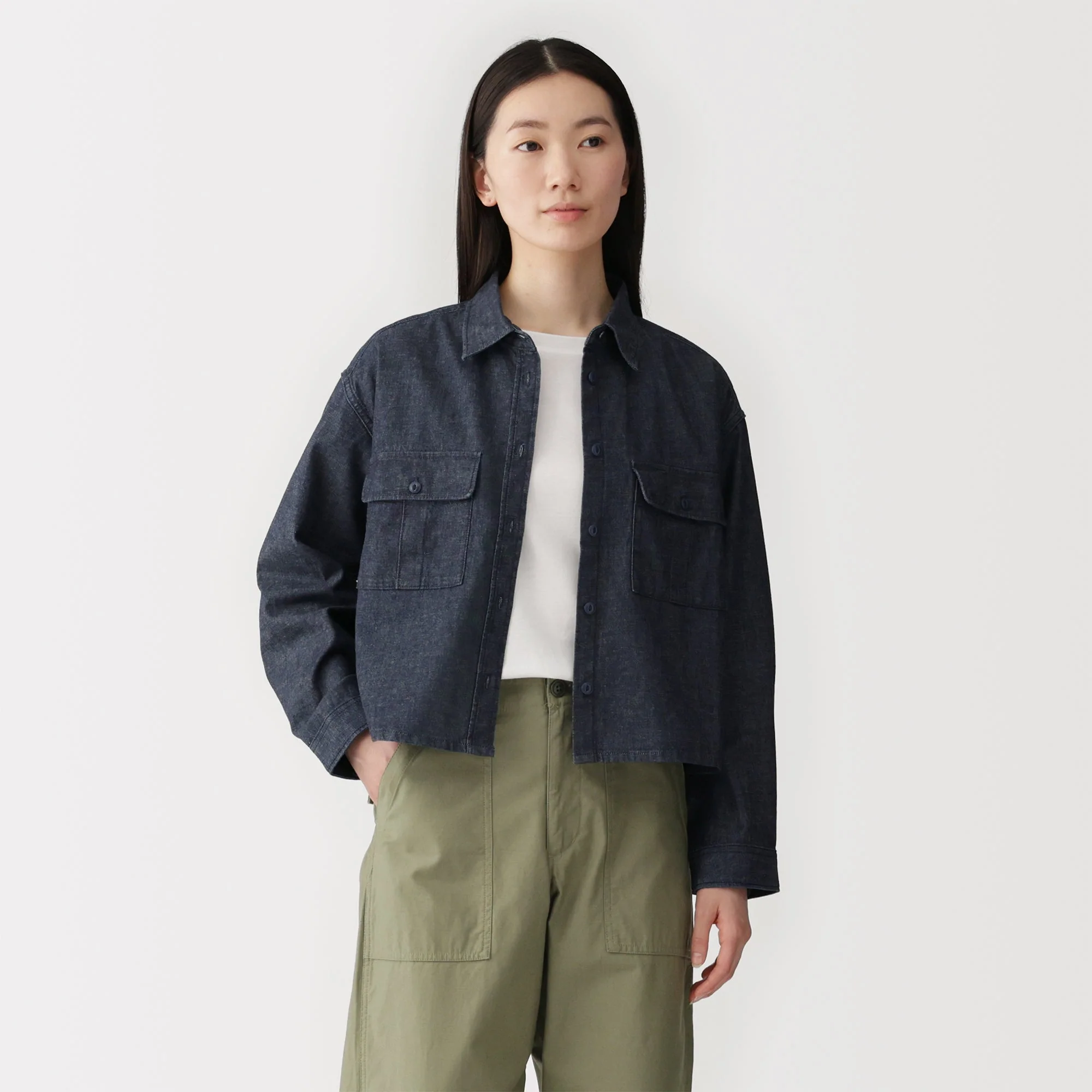 A women's denim long sleeve shirt with a soft, airy texture and lightweight feel. It has a slightly cropped length for a boxy silhouette that pairs well with high-waisted bottoms.