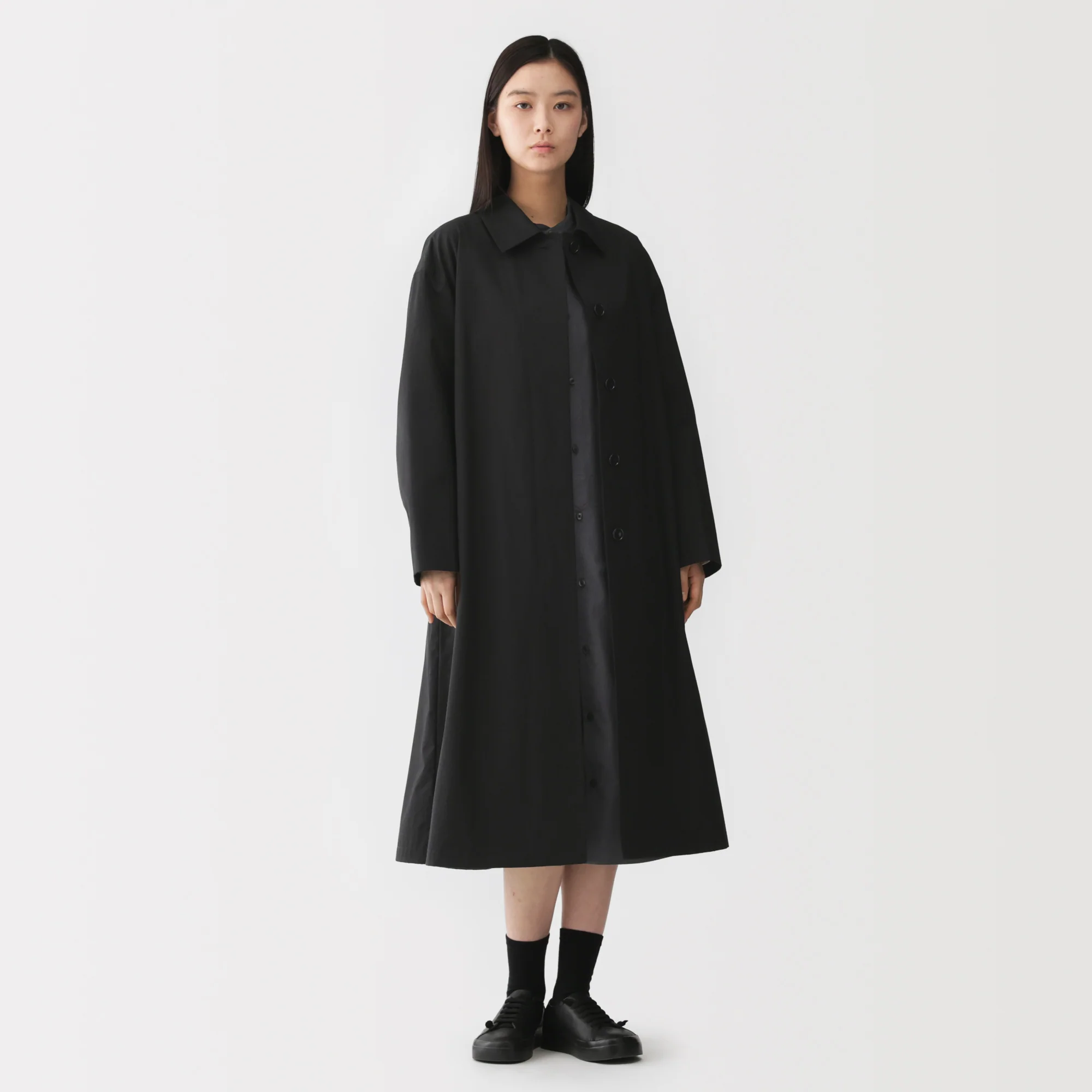 The slightly thick fabric is water repellent yet breathable, made of thin, long-staple cotton yarns that are densely woven together, resulting in a lightweight and sturdy material that is comfortable to wear in any season. The back of the coat is voluminous, creating a three-dimensional, relaxed silhouette.