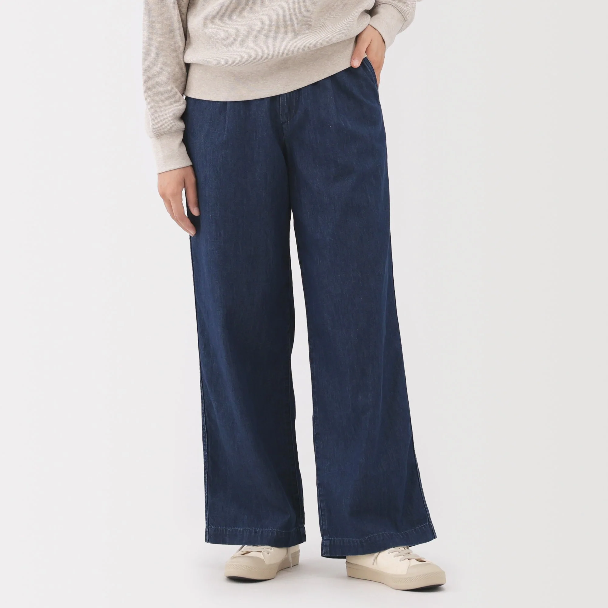 These women's wide pants are made with lightweight organic cotton denim for maximum comfort and flexibility. The front of the pants feature pleats for a clean and polished appearance. The back of the waistband is elastic for a comfortable fit that is easy to wear.