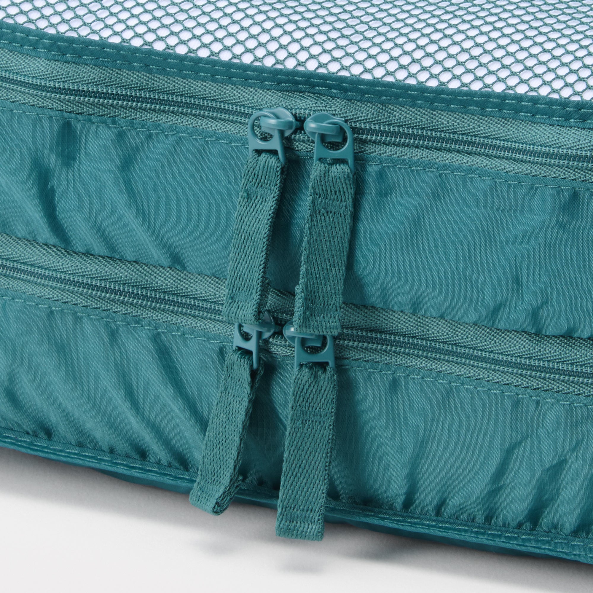 A travel case made from a durable and lightweight mesh fabric. It folds up into a compact and ultra-portable square for easy storage when not in use. The mesh allows you to easily preview the contents. Great for organizing items inside of bags and suitcases for travel.