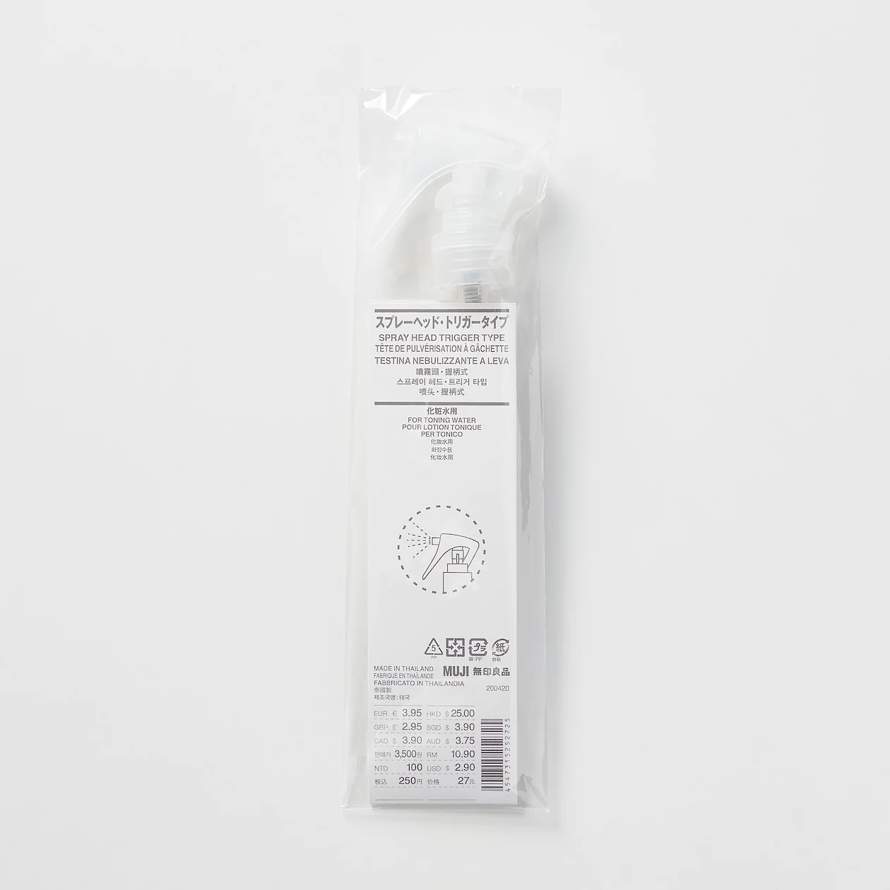 A trigger head that fits in MUJI Toning Water bottles, and sprays a wide, fine mist. Users can spray skincare onto face or straight onto a cotton pad.